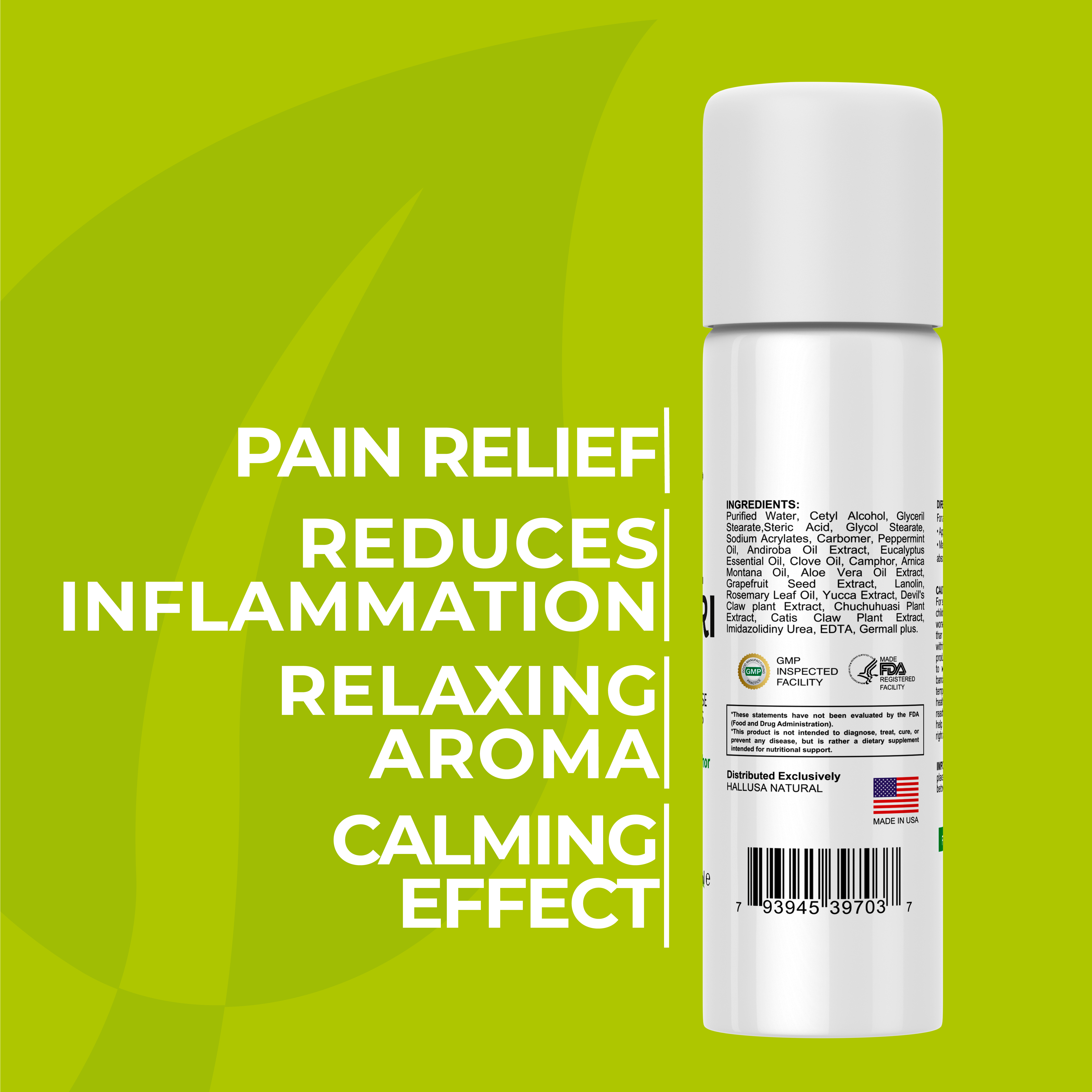 This single item pack contains 90ml of roll-on relief and is proudly made in the US by Hallusa Natural.